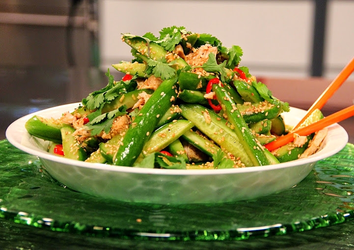 מצרכים:6 רצועות חזה עוף,2 גזרים חתוכים לרצועות בעזרת קולפן,2 מלפפונים חתוכים לרצועות בעזרת קולפן,כוס וחצי של כרוב חתוך לרצועות,פלפל אדום (גמבה) חתוכה לרצועות,פלפל צהוב חתוך לרצועות,בצל סגול קטן (ניתן להחליף בבצל ירוק) חתוך לרצועות,וחצי פלפל אדום חריף חתוך לפרוסות.